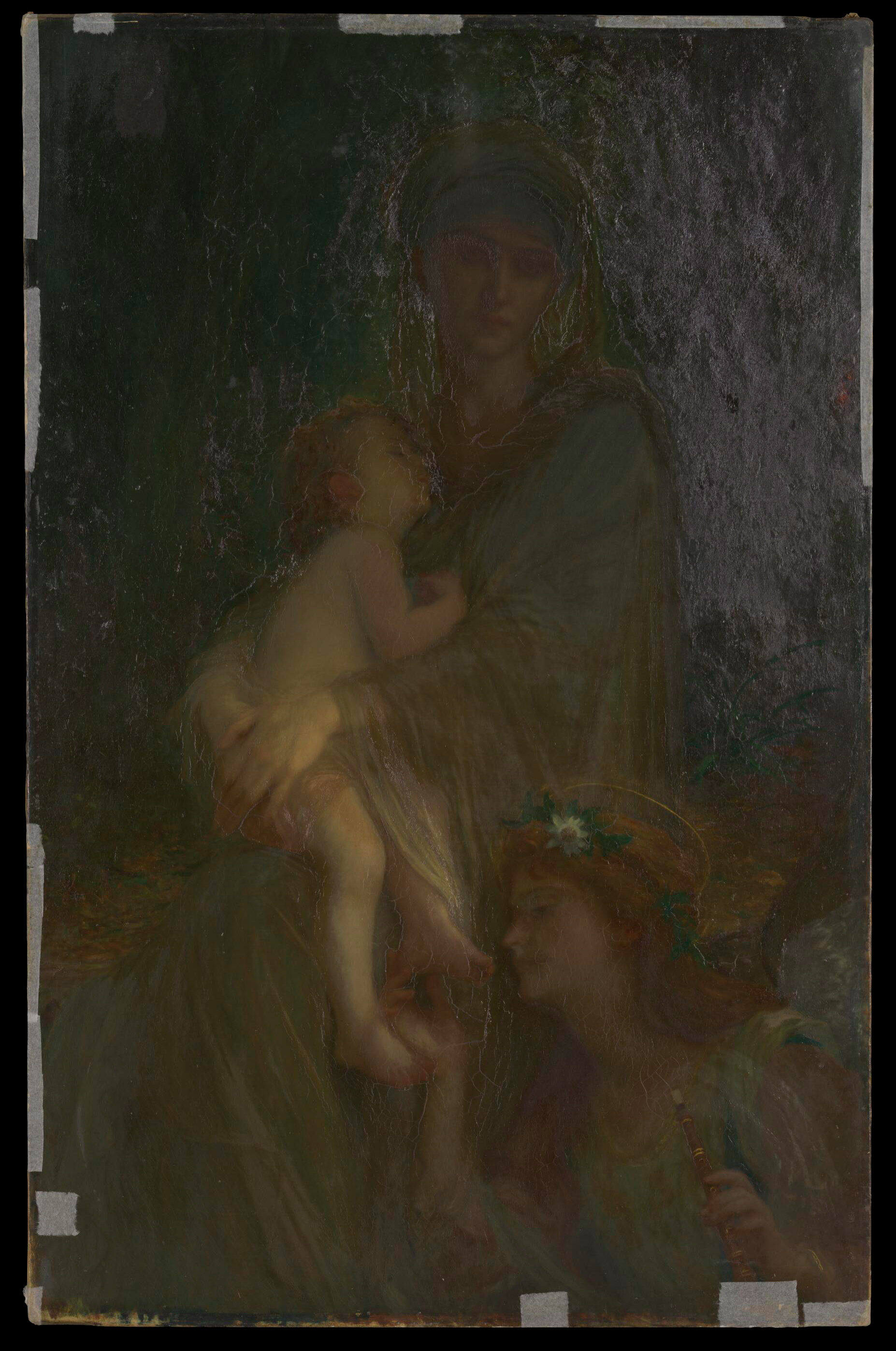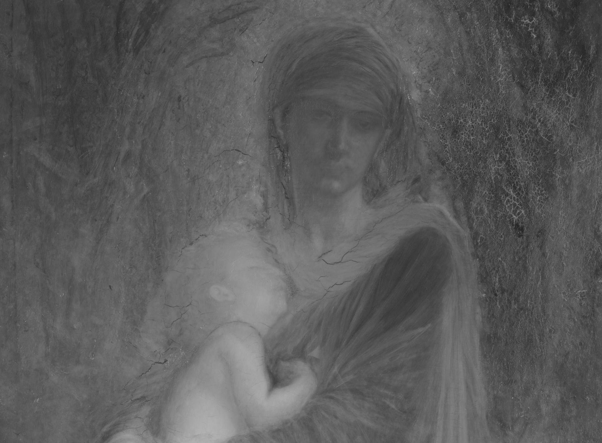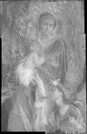 Enfin, un dernier changement a été observé et concerne cette fois la position de l’Enfant Jésus qui a été ici révélée par la radiographie de rayons X. Les études conservées de l’Enfant, figure centrale du tableau, sont relativement nombreuses (plus d’une trentaine) et montrent combien Ernest Hébert a longtemps hésité sur la posture à lui donner.