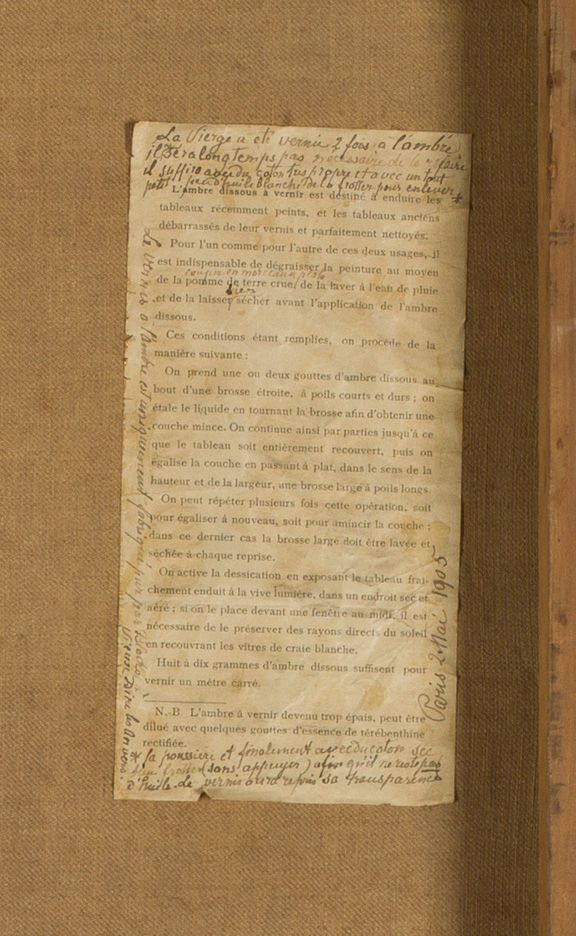 On découvre par ailleurs, au revers de la toile, un extrait du compendium du marchand anversois décrivant la méthode d'application du vernis à « l'ambre dissout ». L’ambre, selon Jacques Blocks, devait prévenir toute altération des matériaux. Or, dès le début de la création de l’œuvre, il est apparu que sa mise en œuvre posait pour le peintre des difficultés, comme celle du séchage entre les couches de peinture. Néanmoins, en respectant les directives du fournisseur, Hébert a pu mener à bien son travail. Gabrielle Hébert y ajoute une note manuscrite en date du 2 mai 1905, précisant qu'elle a reverni à l'ambre l’œuvre par deux fois et qu’« il sera longtemps pas nécessaire de le refaire ». Elle ajoute des conseils visant à retrouver la transparence du vernis, vernis qui pose aujourd'hui problème.