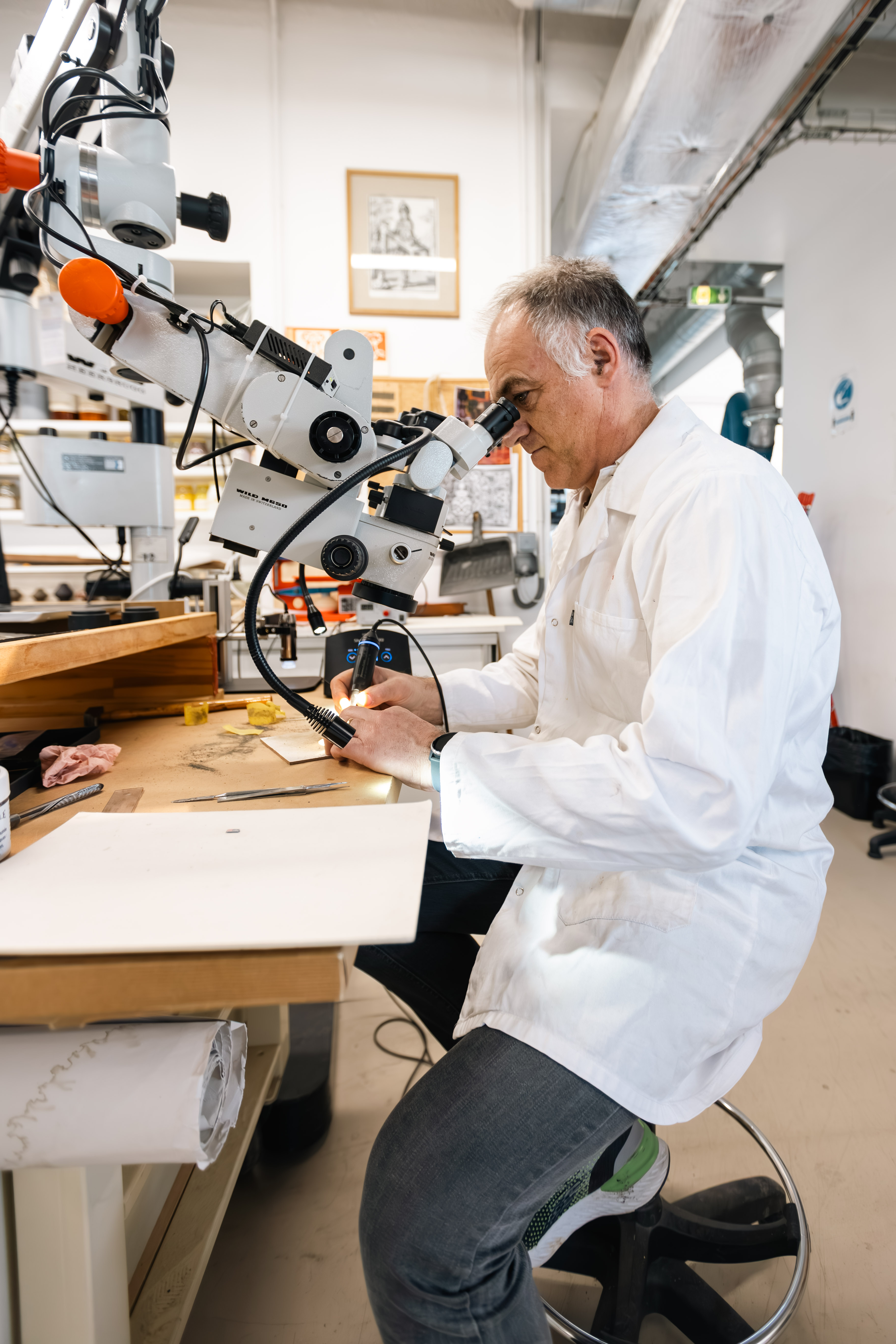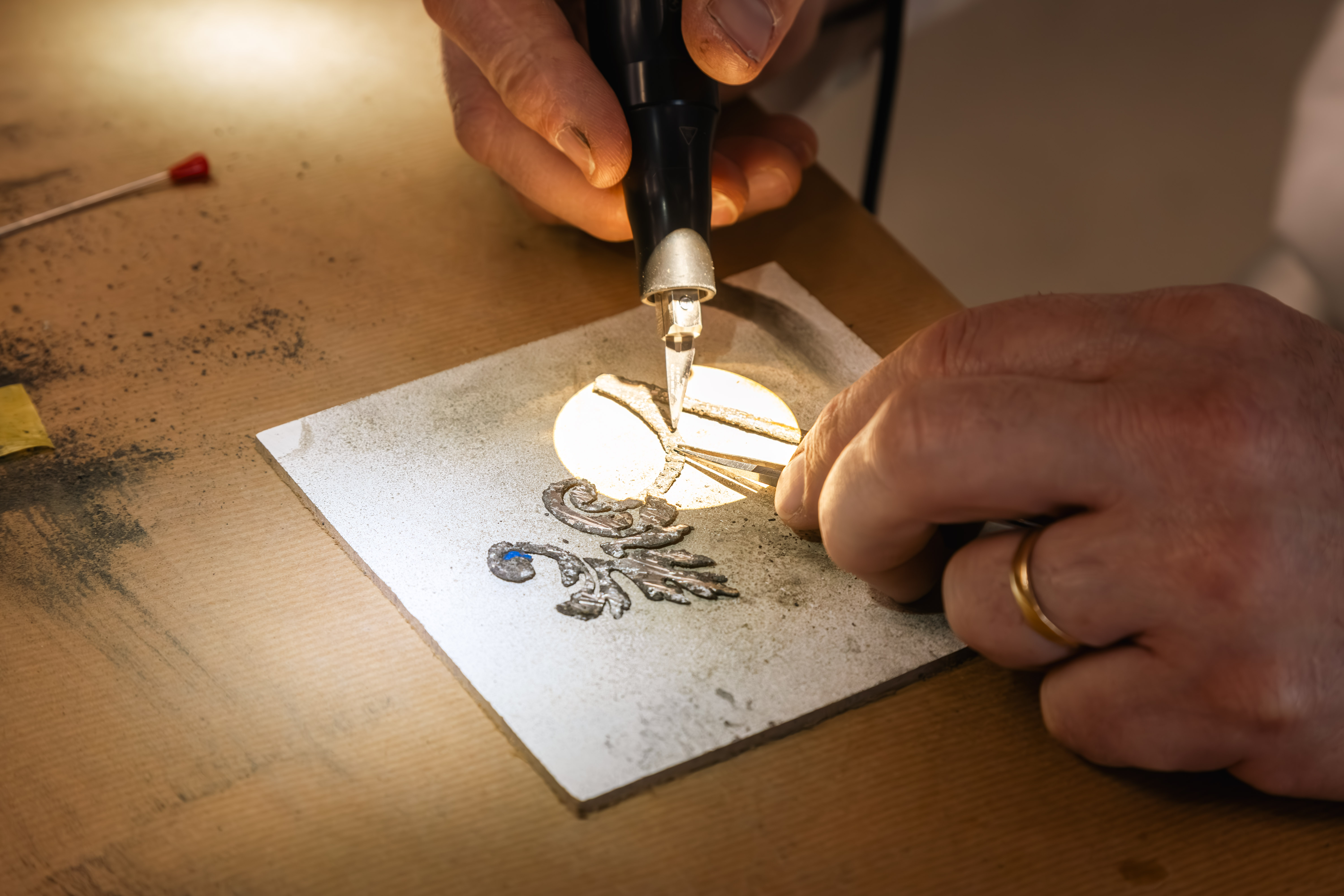 Un travail de précision sur les filets d’étain Chaque filet d’étain a fait l’objet d’une attention méticuleuse. Sous une loupe binoculaire équipée d’un scalpel à ultrasons, la corrosion située à proximité des placages d’ébène a été délicatement retirée, sans étirer la matière devenue particulièrement fragile. Sur les trois faces internes des 160 mètres de filets, la corrosion a été systématiquement clivée, réduisant parfois leur largeur de 3 mm à seulement 1 mm. Les filets les plus endommagés, dont l’épaisseur d’origine était de 1 mm, entièrement corrodés, ont été remplacés par des filets neufs. Pour combler les lacunes, un mélange innovant — composé de poudre d’étain, de microbilles de verre et de colle de poisson — a été testé et vieilli artificiellement avant application. Ce matériau, compatible avec les techniques utilisées en 1686, date de réalisation des gaines (comme la colle animale), offre une solution à la fois stable, réversible et visuellement fidèle à l’étain d’origine, tout en restant identifiable pour un œil expert.