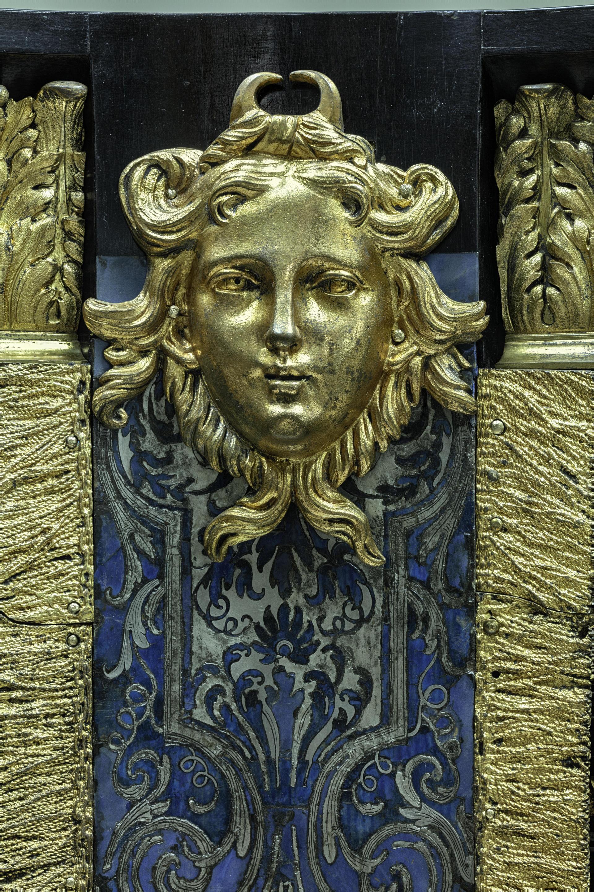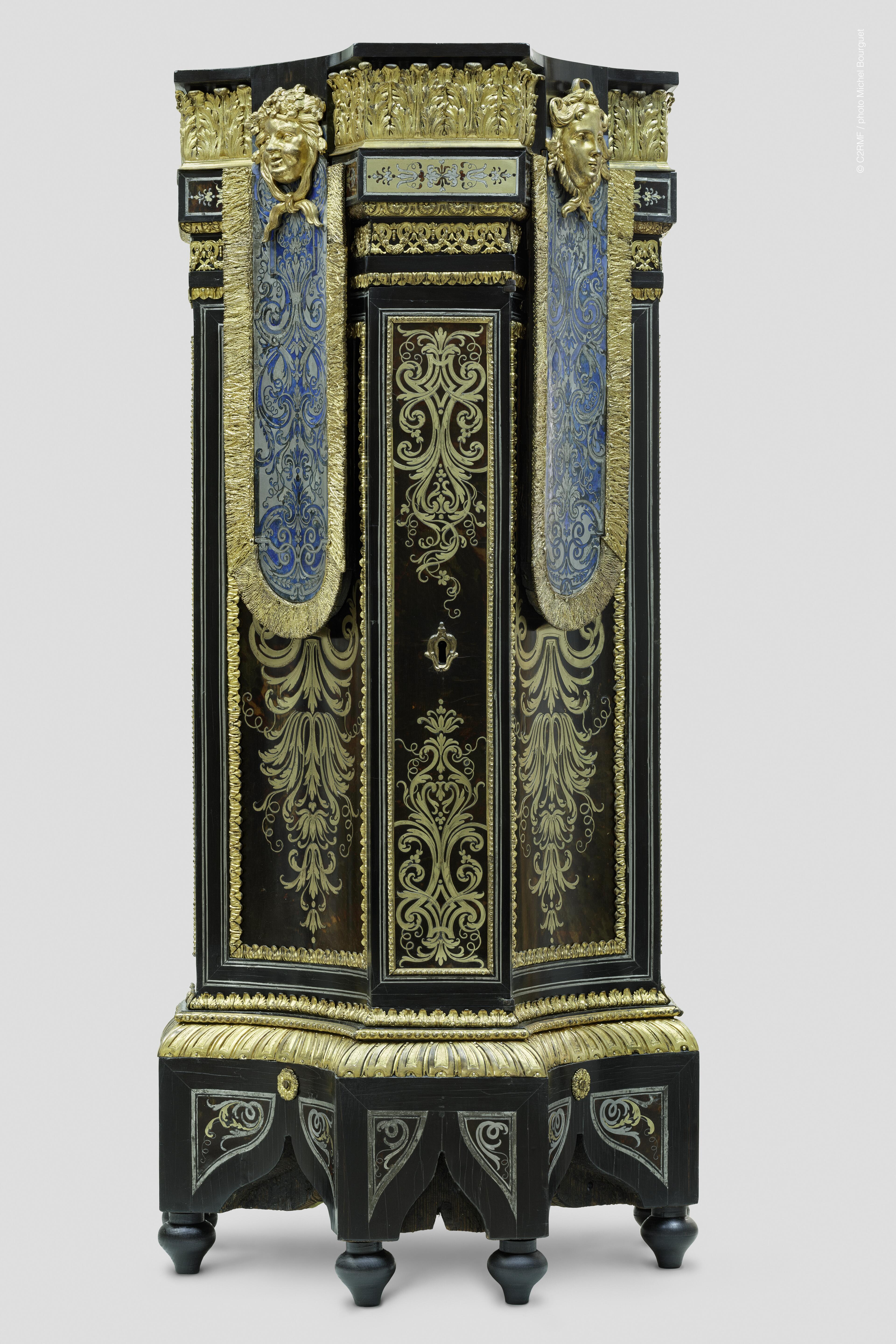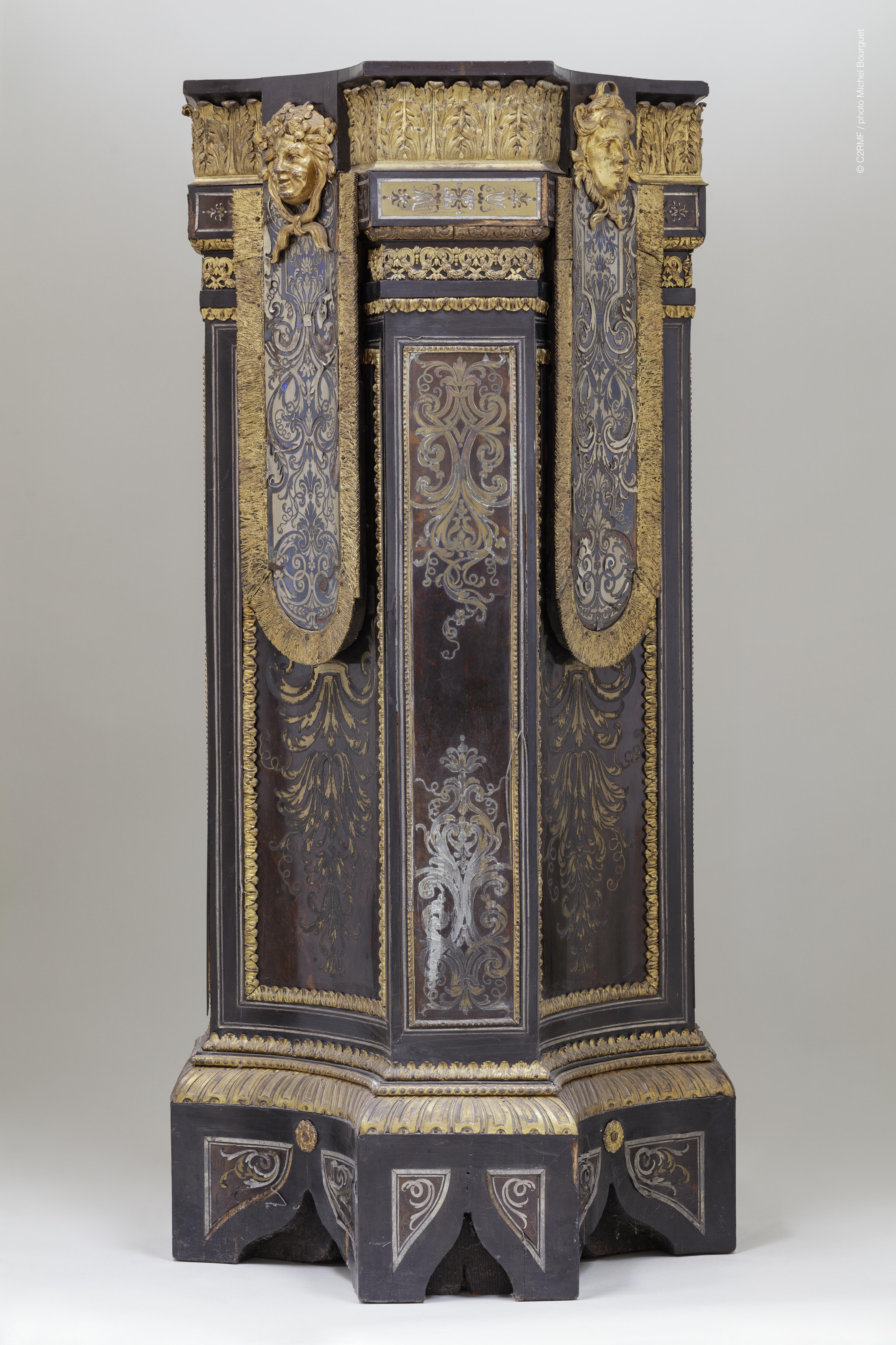 Comprendre les transformations d’une œuvre à travers les siècles Les indices recueillis permettent d’esquisser plusieurs scénarios sur l’histoire de ces meubles. Un document clé, l’inventaire du cabinet de Monseigneur le Dauphin à Versailles en 1689, décrit ainsi les objets : « Deux gros escabellons à huit pans, dont quatre sont creux et les quatre autres pleins, à fond d’écailles, ornés de feuillages de cuivre et enrichis de moulures ciselées de cuivre doré. Au-dessus se trouve un tapis à quatre pentes, dont le fond est bleu lapis et étain, décoré de feuillages similaires, avec un mollet de cuivre doré autour de chaque pente. Chaque escabeau repose sur huit pommes d’ébène couvertes de cuivre doré godronné. L’un des pans se ferme à clé. Hauteur totale : quatre pieds deux pouces. »