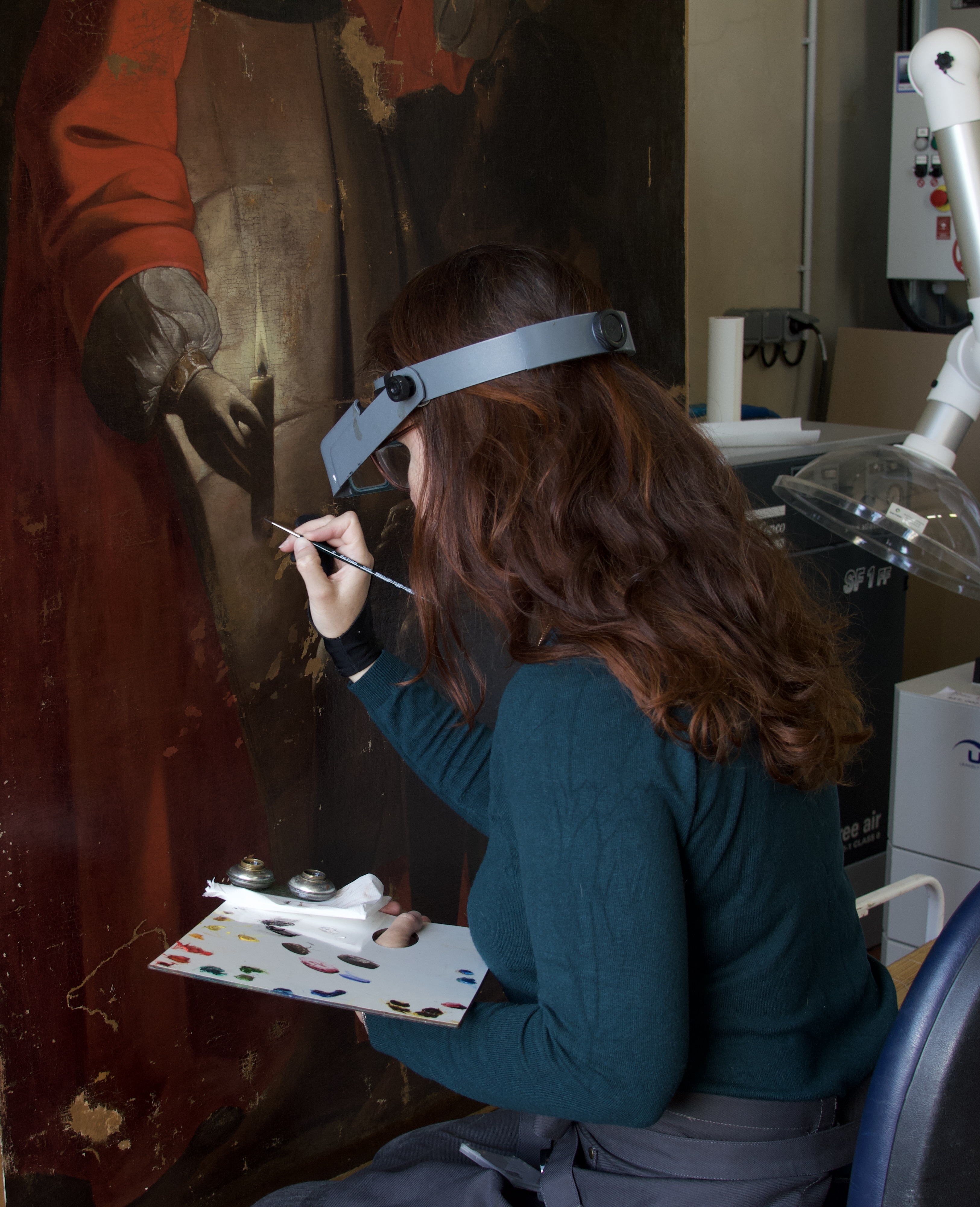 Une intervention fondamentale de couche picturale a permis de retrouver des coloris et une texture de surface plus fidèles aux intentions de l’artiste, et de remettre en valeur les contrastes et les grandes masses colorées constitutives de cette composition hiératique et moderne. Une fois la surface de la peinture libérée des matériaux exogènes appliqués lors des précédentes campagnes de restauration, nous avons pu prendre la mesure du fort niveau d’usure et du nombre important de lacunes, qui ont nécessité un long et minutieux travail de réintégration colorée. L’enjeu de cette intervention était de trouver le juste niveau de retouche, nécessaire et suffisant pour permettre à la fois de retrouver une lecture fluide des formes et de la composition, et de conserver un degré d’usure perceptible, témoignant de l’histoire matérielle de la peinture et respectant la finesse du travail du peintre.