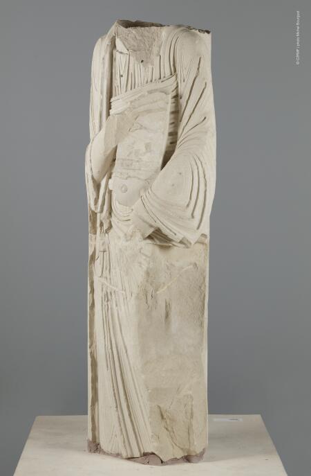 Sur les statues-colonnes, l’intervention a principalement consisté en une dérestauration des remontages archéologiques réalisés juste après leur découverte en 1977, notamment pour les statues de Saint Paul et de Salomon. Un remontage plus juste des différents blocs qui les composent a pu être entrepris. Le choix a été fait de restituer les lacunes de manière illusionniste, afin de faciliter la lecture des volumes et mettre en valeur ces chefs-d’œuvre de la sculpture gothique (fig.2 à 4).