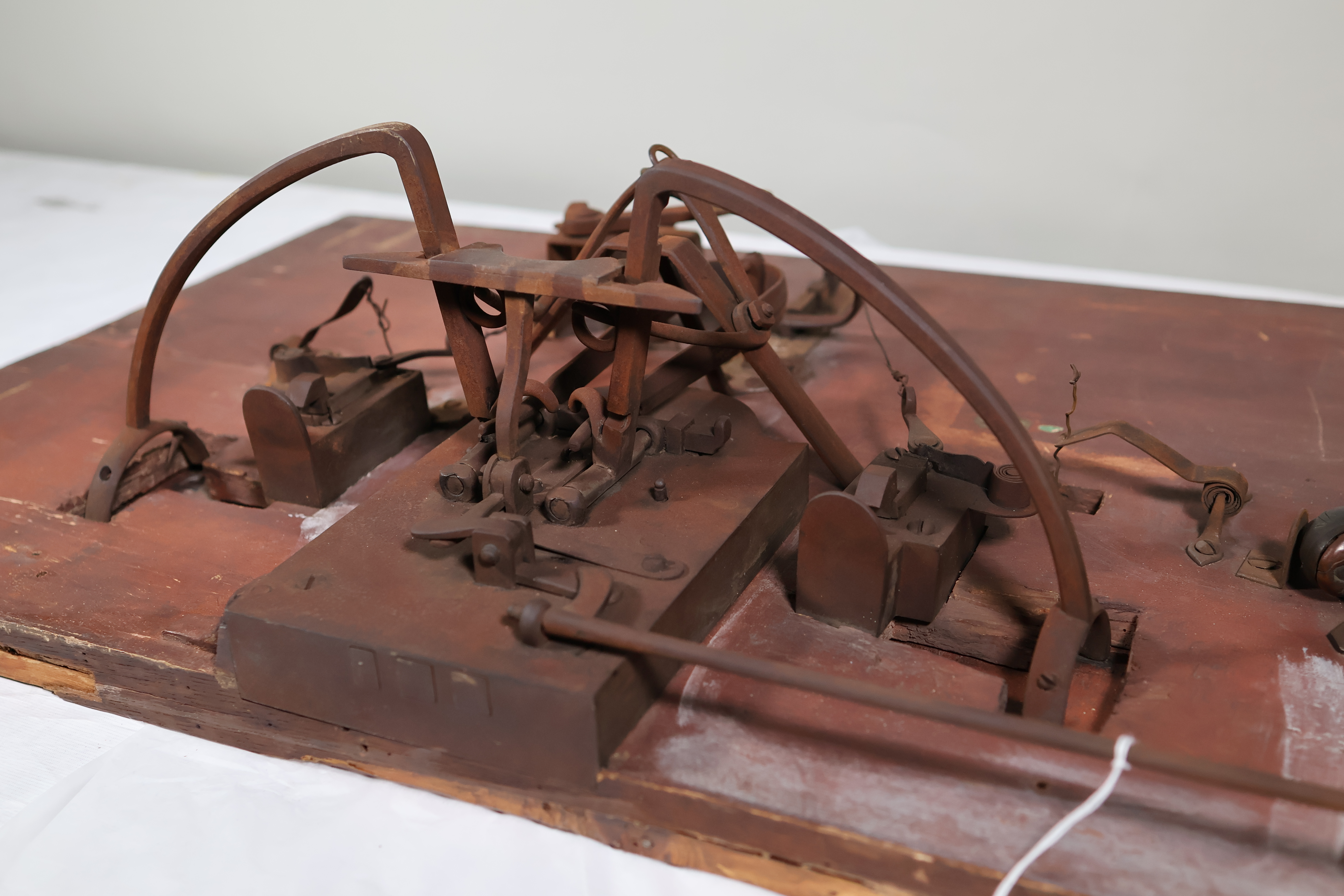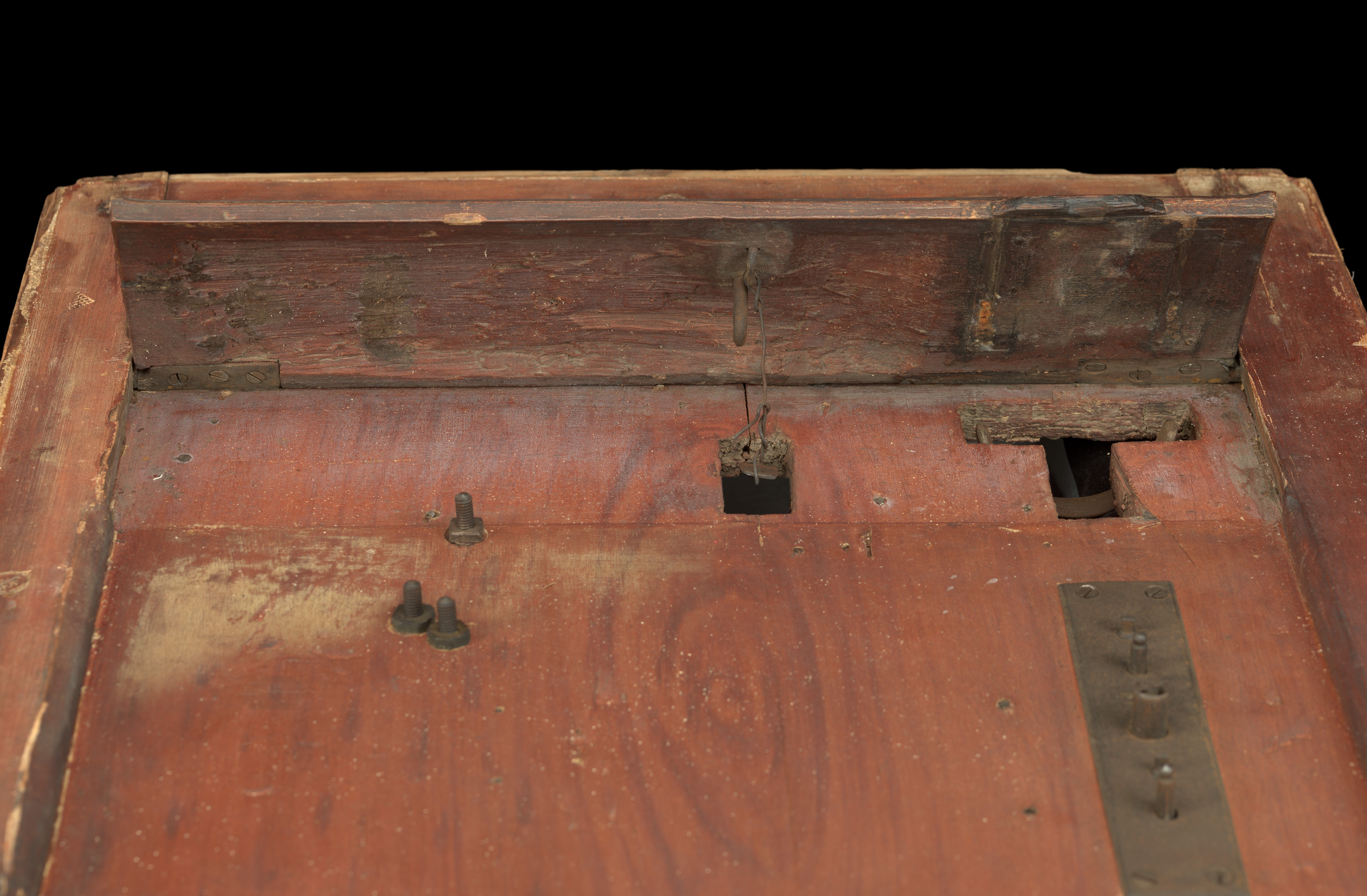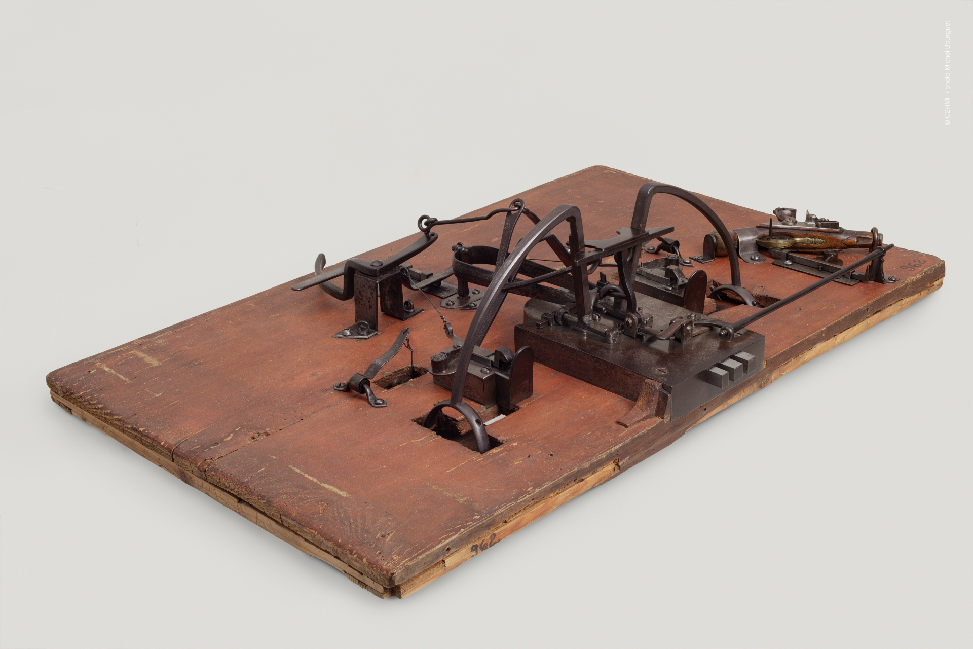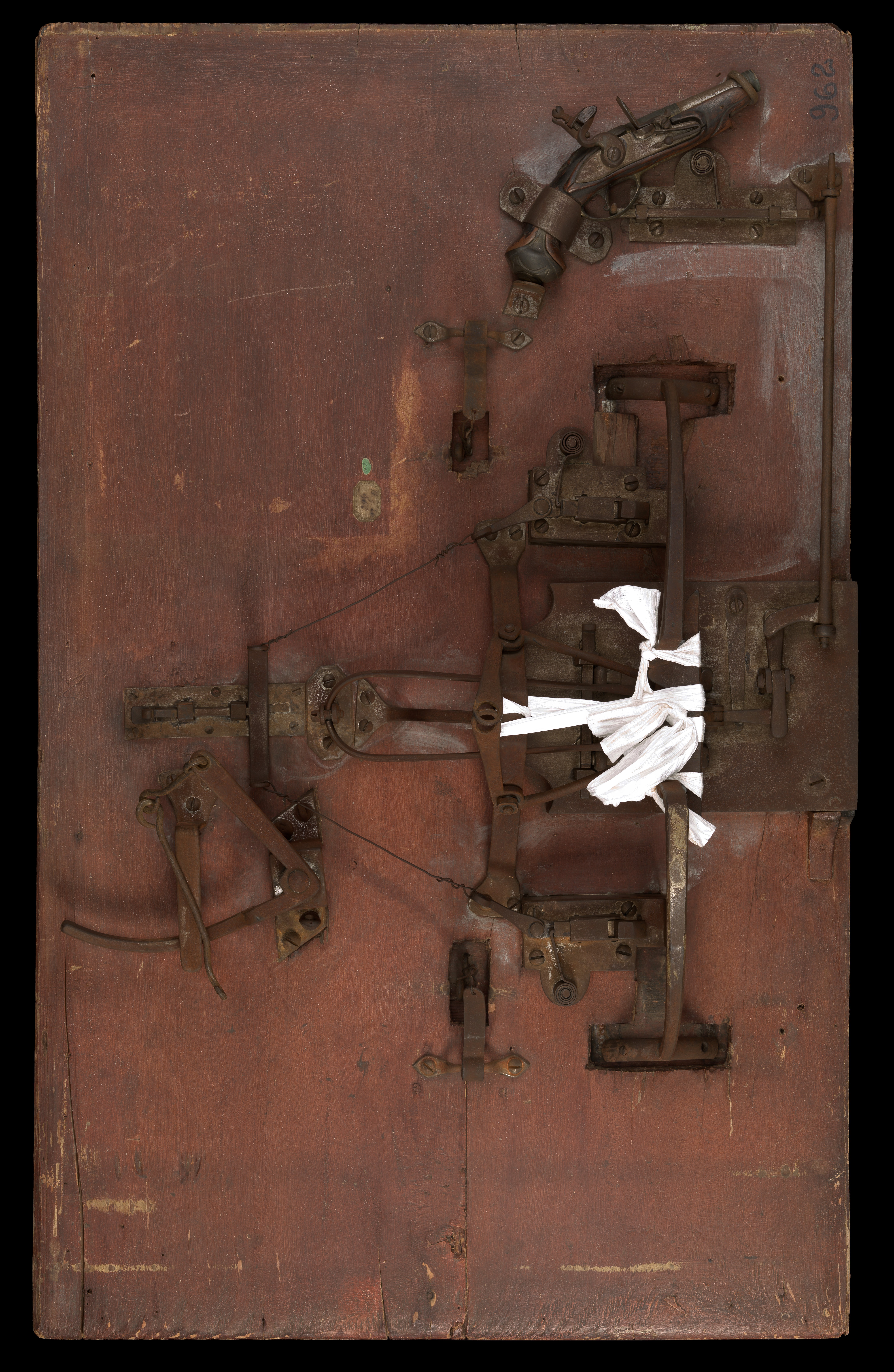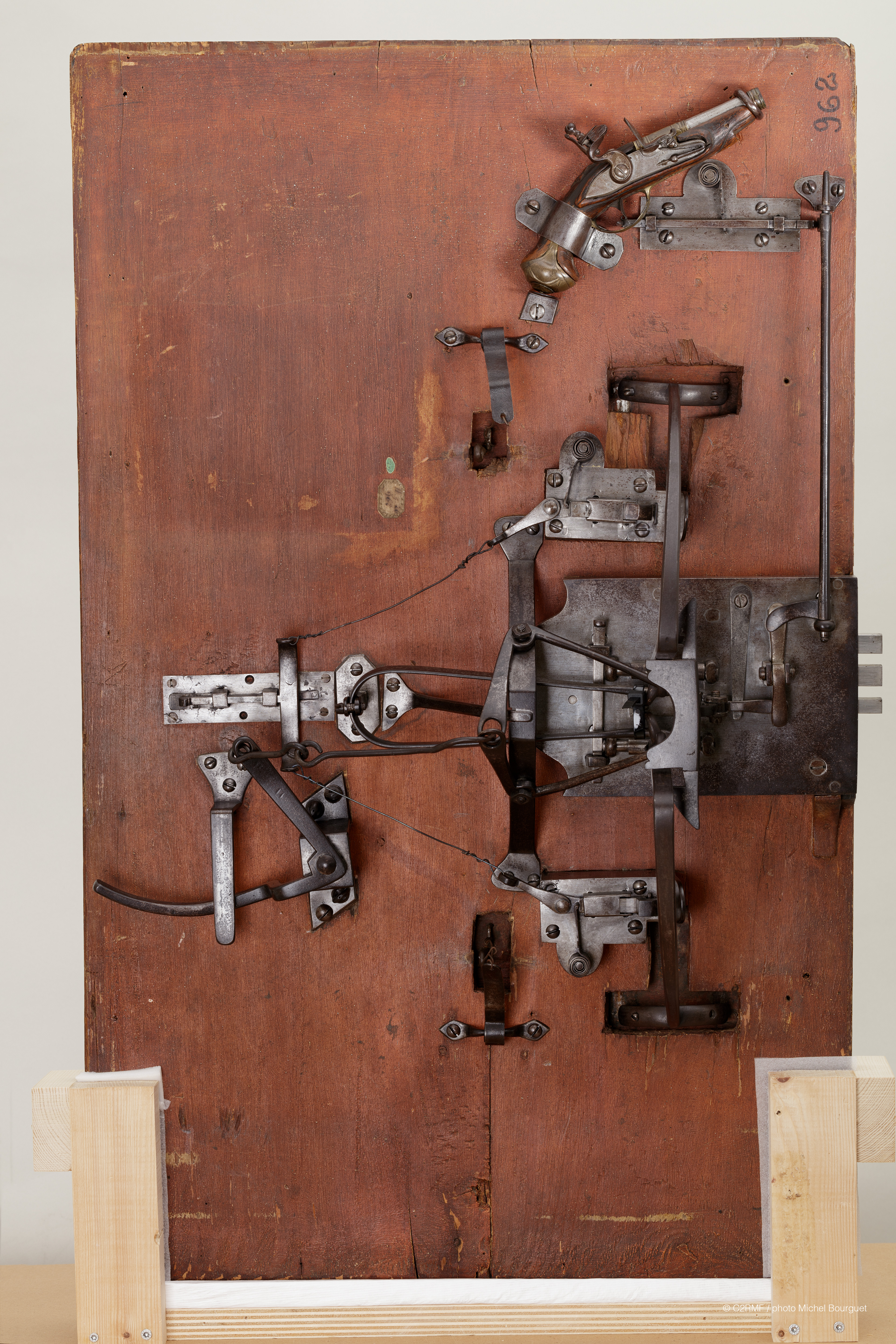 Afin de comprendre le mécanisme, de faciliter le nettoyage du support et d’effectuer le retrait des produits de corrosion, les différents systèmes ont été démontés du panneau de bois lorsque c'était possible. Les fentes et altérations structurelles instables de la porte ont été infiltrées, collées ou comblées selon la nécessité et après discussion avec la responsable des collections. Les surfaces polychromes de nature huileuse, fortement encrassées, ont été nettoyées à l’aide d’éponges microporeuses imprégnées d’eau ajustée. Les produits de corrosion de l’alliage ferreux ont été retirés par micro-sablage d’abrasif végétal, puis les surfaces ont été stabilisées par application d’acide tannique additionné d’acide orthophosphorique. L’ensemble des parties métalliques a ensuite été protégé par une couche de cire microcristalline appliquée à chaud. Les oxydes de cuivre noirs et épais se trouvant sur les garnitures du pistolet en alliage cuivreux ont été allégés à l’aide d’une solution de citrate de sodium à pH 6 et à faible concentration (0,1M) appliquée en gel (a été d’Agarart® à 4% p/v). La notice en papier a été restaurée par une conservatrice-restauratrice spécialiste d’arts graphiques, Anaïs Diez.