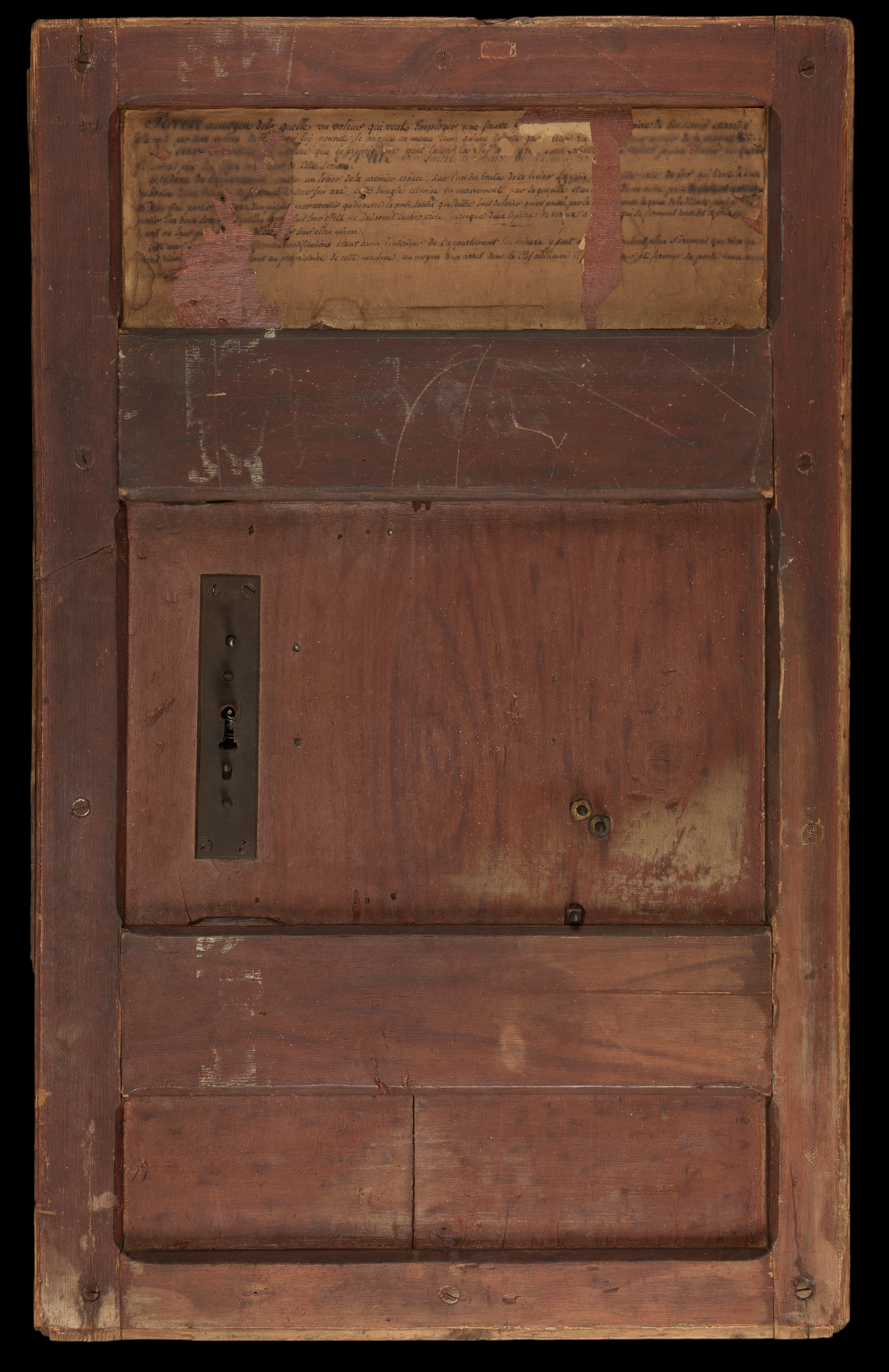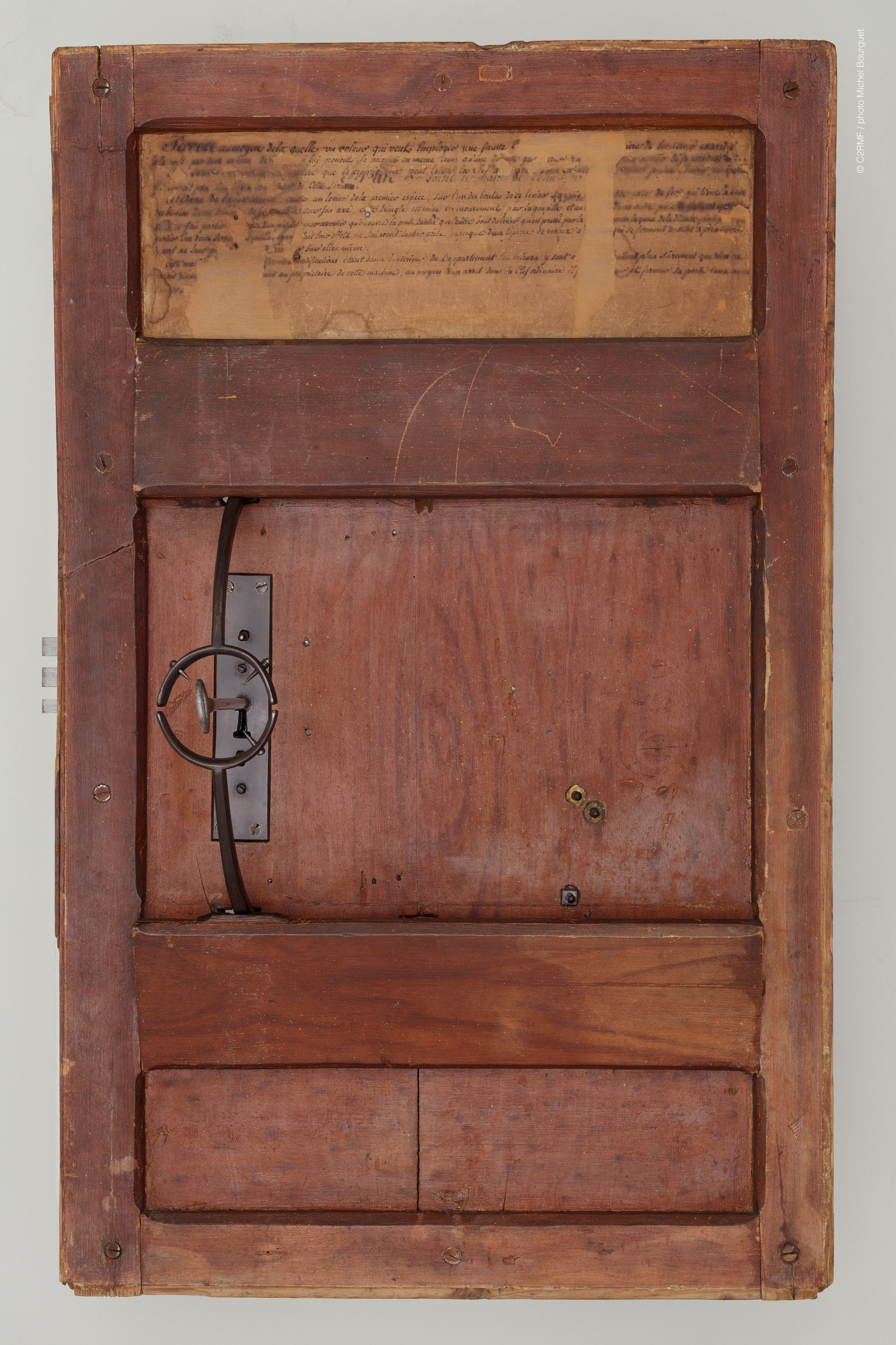 L’auteur de la serrure est donné par Pahin de la Blancherie dans, Nouvelles de la république des lettres et des arts, 22 mai 1782, p.151-152. Il s’agit du Sieur Merlin, dit le Petit Suisse, compagnon serrurier, rue du Four, fossés Saint Germain, chez l’Epicier. La description intégrale de l’objet se trouve dans l’article du même journal du 29 mai 1782, p.159,-160. Elle permet de compléter le texte manuscrit lacunaire qui se trouve sur l’avers de la porte, servant à la fois de notice d’utilisation et de réclame publicitaire, vantant l’intérêt de cette invention.