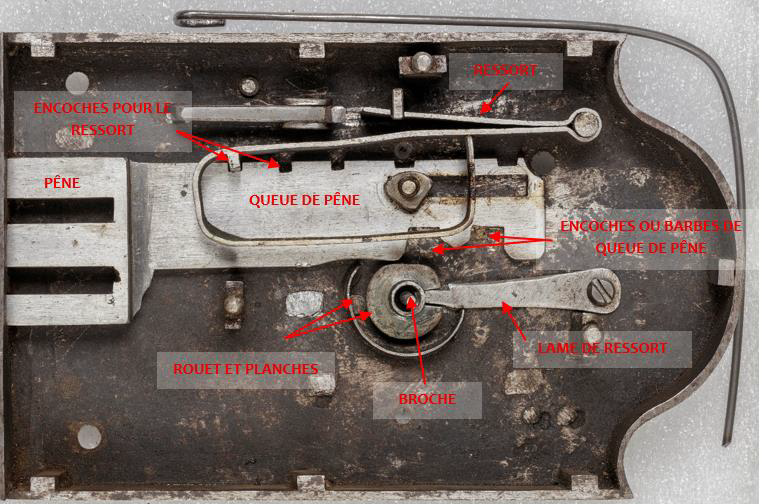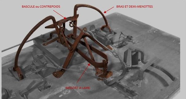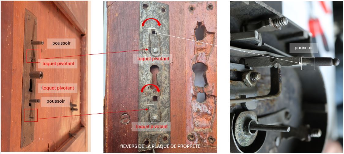 - Un premier niveau de sécurité permet de maintenir bloqué deux tiges carrées nommées poussoirs. Ces derniers sont retenus par deux loquets fixés au revers de la plaque de propreté.