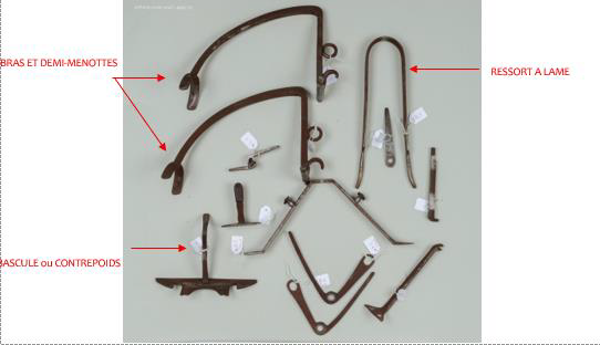 Le système d’entrave repose en partie sur le revers de la porte et en partie sur le revers du palâtre de la serrure. Ce système fonctionne grâce à un important ressort à lame maintenu en tension par une bascule qui soutient les bras des menottes. Une fois ce contrepoids renversé, le ressort est libre de propulser les deux demi-menottes vers les volets, immobilisant et blessant le cambrioleur grâce aux quatre pointes acérées placées à l’intérieur des arcs. Ces pointes sont vissées, elles peuvent donc être démontées si nécessaire.