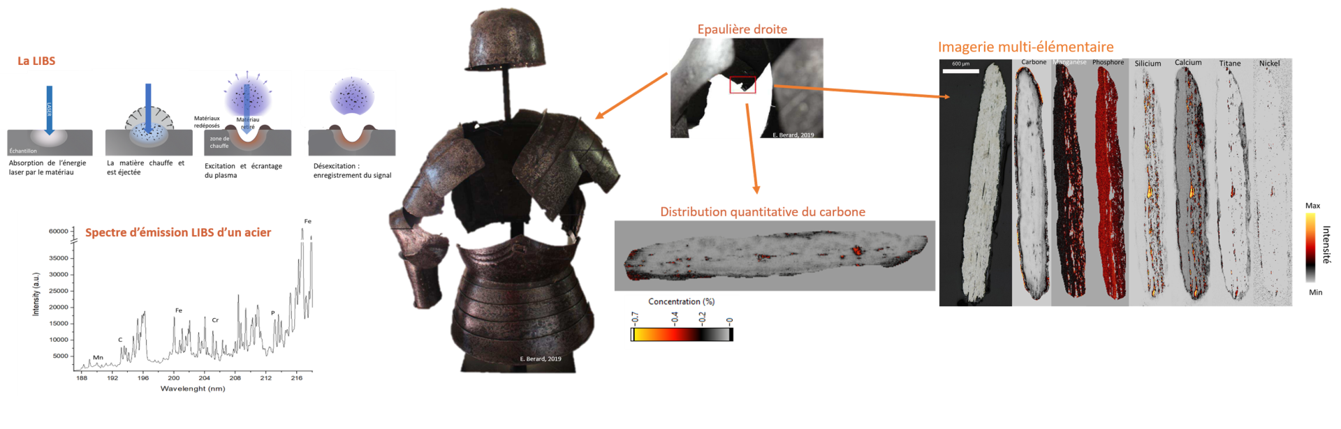 L’évolution des techniques métallurgiques anciennes, les choix artisanaux et la circulation des savoir-faire sont des questions majeures en archéométrie. Parmi les matériaux étudiés, les alliages ferreux anciens — utilisés pour la fabrication d’outils, d’armes ou de structures de monuments — présentent une grande hétérogénéité de composition, notamment en ce qui concerne les éléments légers tels que le carbone et le phosphore. Ces éléments jouent un rôle déterminant dans les propriétés mécaniques des objets (résistance, dureté, aptitude à la trempe) et constituent des traceurs historiques et technologiques des chaînes opératoires anciennes. Leur localisation et leur quantification sont donc essentielles pour mieux comprendre les pratiques sidérurgiques du passé.