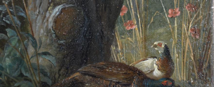 Exemple d'emploi du vermillon : détail de Chien en arrêt sur deux faisans montrant le contour rouge des yeux des faisans © Claire Betelu
